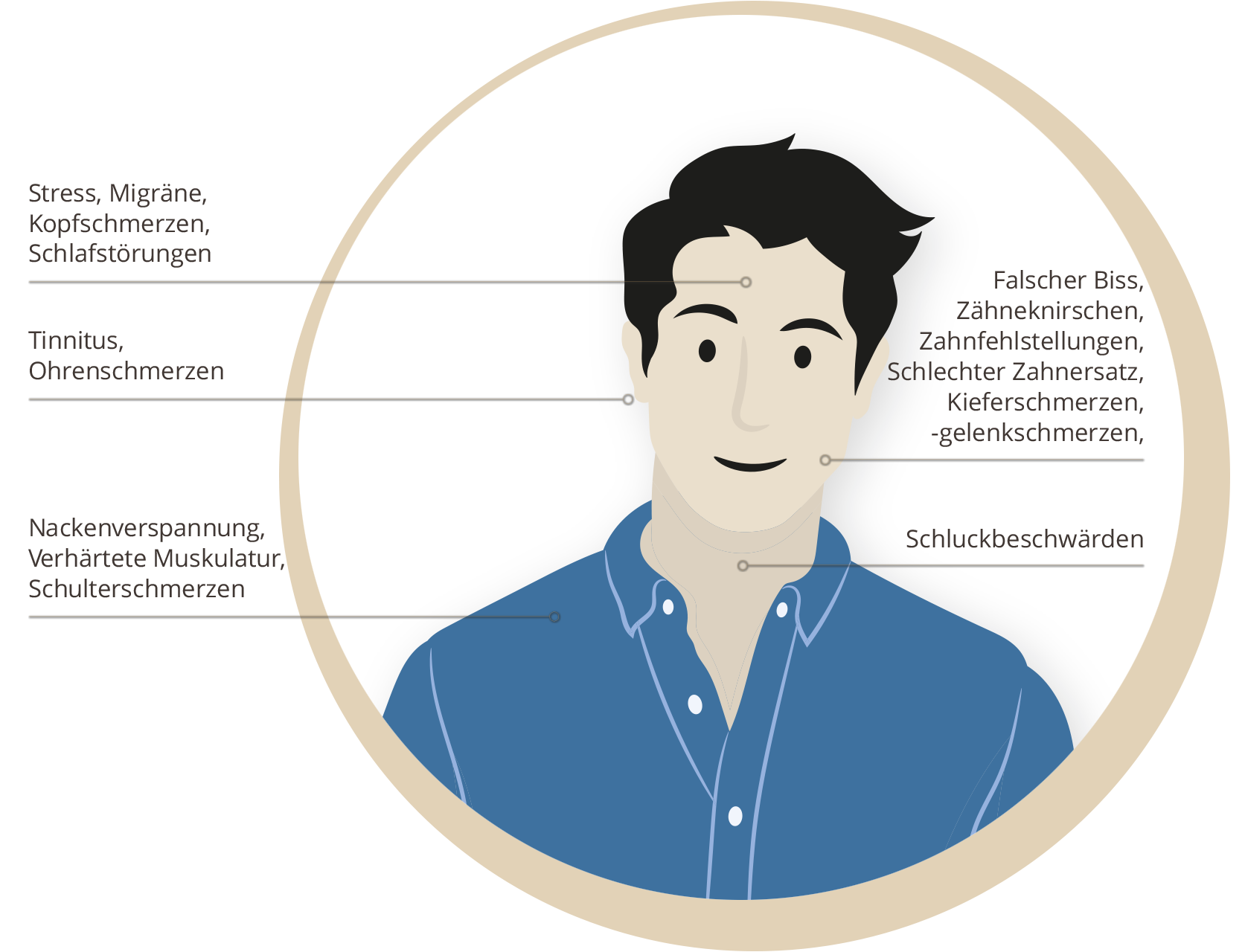 Das Kiefersystem kann Ausgangspunkt von Kopfschmerzen, Migräne oder Schwindel sein. Sowohl ein falscher Biss, als auch Stress kann zu Verspannungen der Kau-, Kopf- und Gesichtsmuskulatur sowie Problemen in der Wirbelsäule führen.